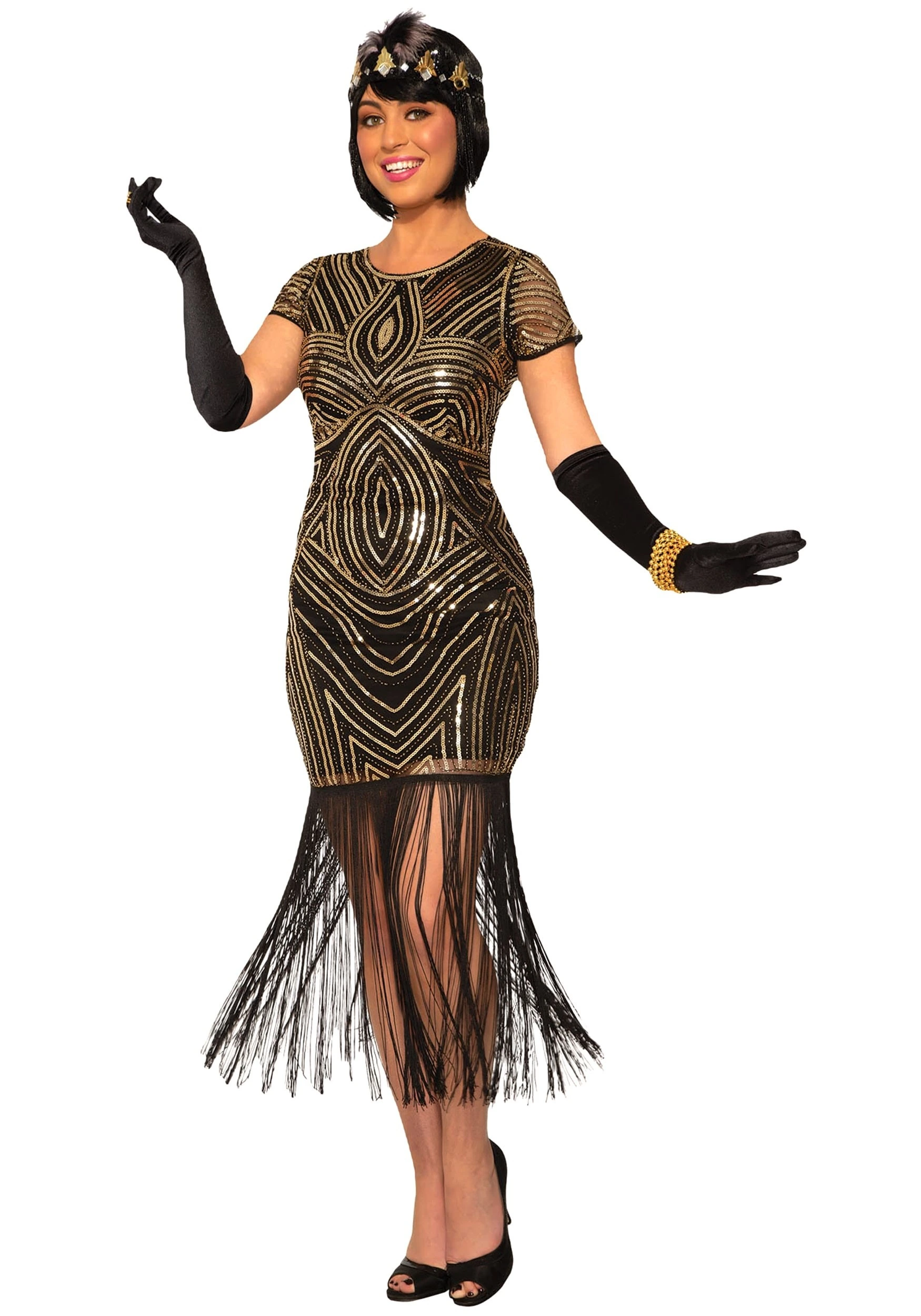 Shine like your best 1920s art deco self when you get this Women’s Flapper Dress. This stylish number features a black dress with a sheer overlay, with shimmering gold sequins attached and arranged for an art deco influenced design. The bottom hem of the dress has long strips of fringe fabric attached which adds a touch of elegance and extra effect in particular when you twirl or take to the dance floor.