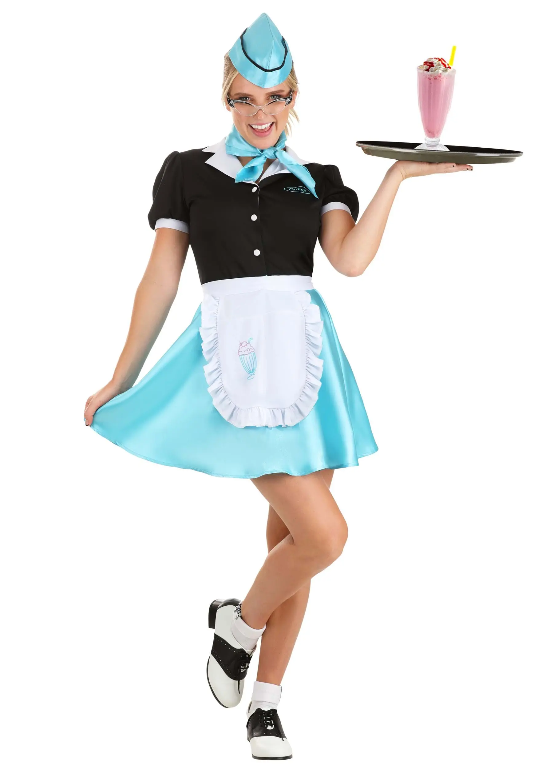 Live your 1950s dreams in an exclusive Car Hop Waitress Costume for Women! The adorable minidress has a black top with slightly puffed sleeves, a white collar and white buttons down the front. An printed blue logo on the left side of the chest reads “Carhop.” The turquoise satin skirt matches the sweet waitress cap and the blue scarf that you can style however you like. To cap off the cuteness, tie the ruffled apron around your waist!