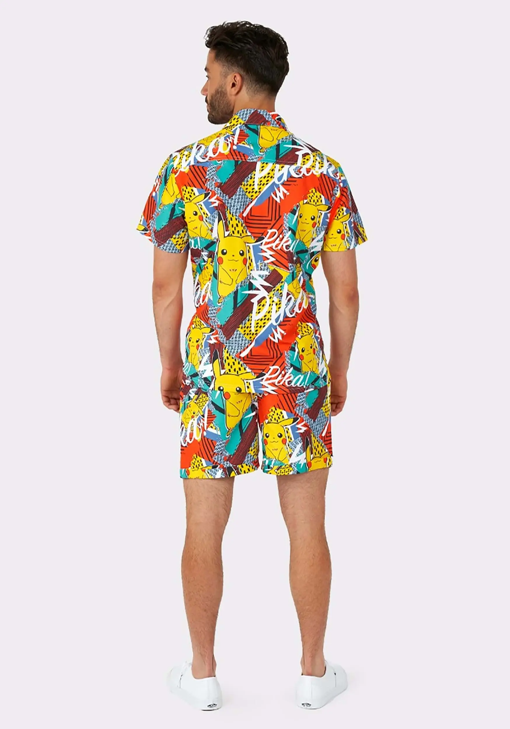 This outfit is made of 100% polyester peach fabric. Pikachu and a multitude of fun patterns are printed all over the shirt and trunks. The shirt has a button-down front. There is an adjustable waistband around the shorts. The shorts have side pockets and a back pocket. It is designed with a modern tailored fit.