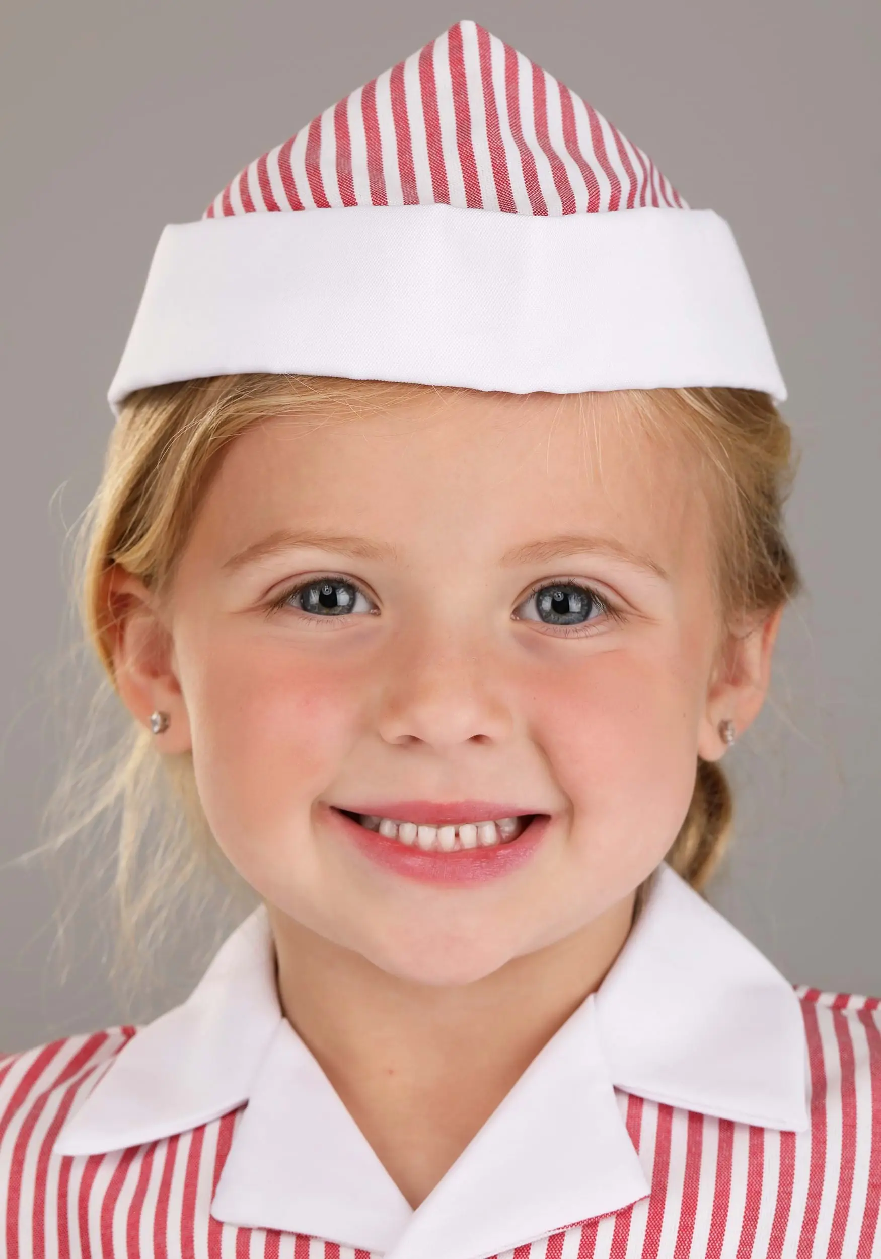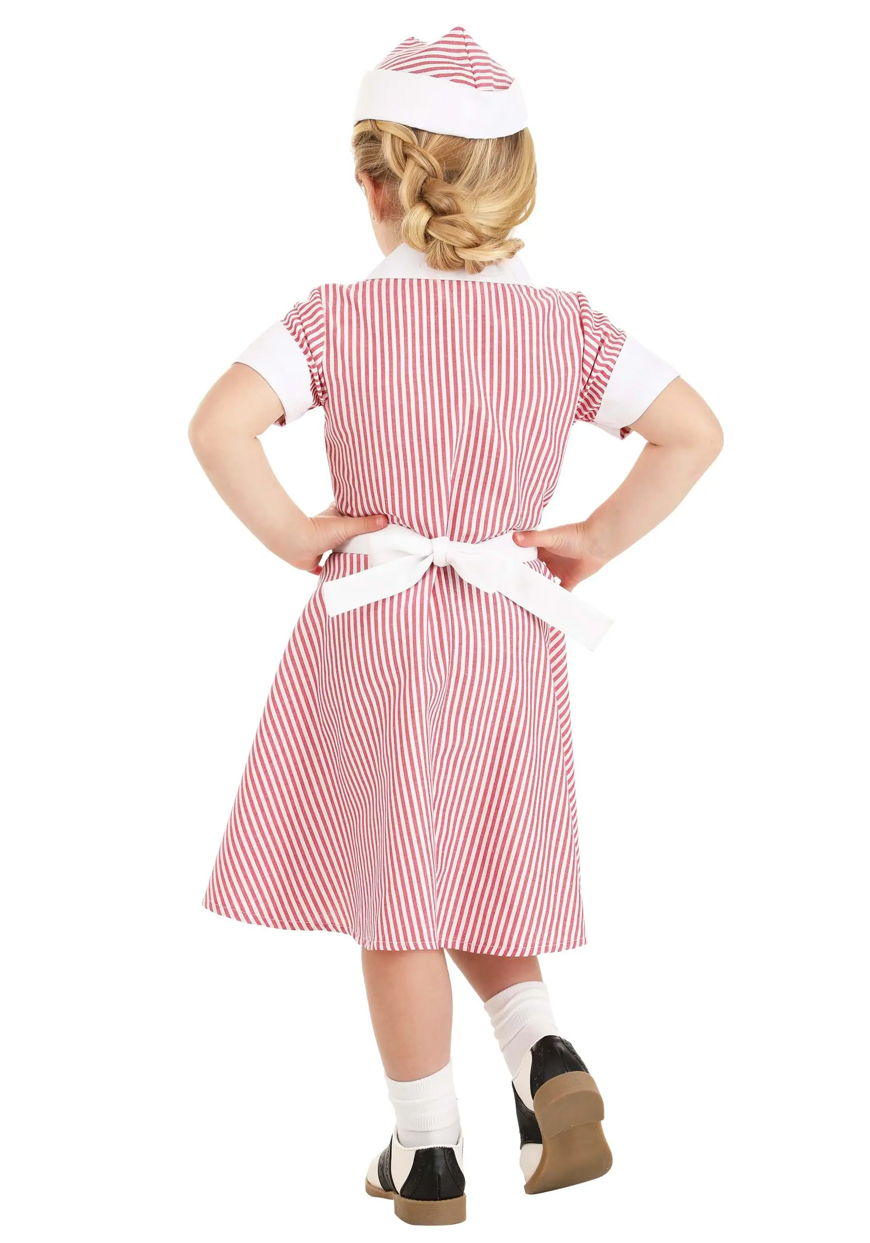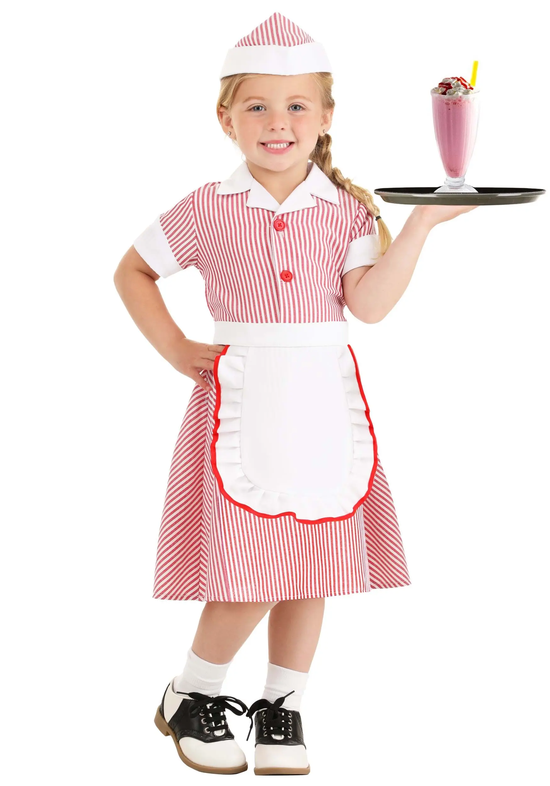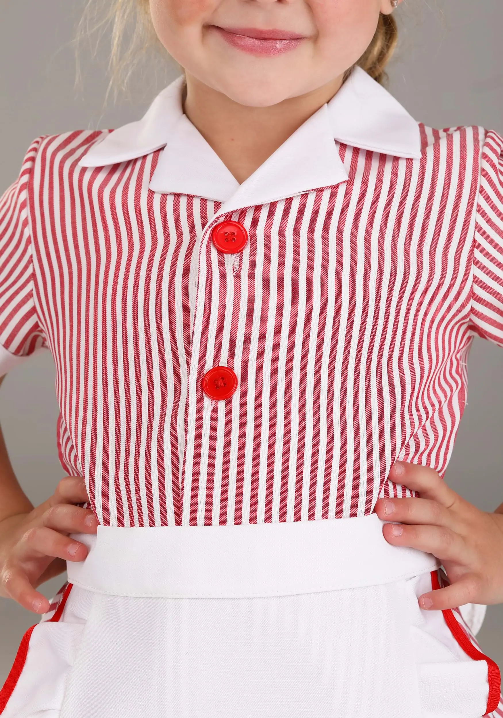Making sure your toddler is set up to excel in life is very important, and that is why we recommend getting her started early with this Toddler Car Hop Costume. This “Made By Us” costume was put together by our hard working and careful artisans, so you will feel good about wearing this for years to come. The dress and stylish hat are what will make your toddler stand out. With that classic pinstriped dress and apron, we are sure your child will make an impression! Soon, she will be employee of the month at the local drive-in restaurant!